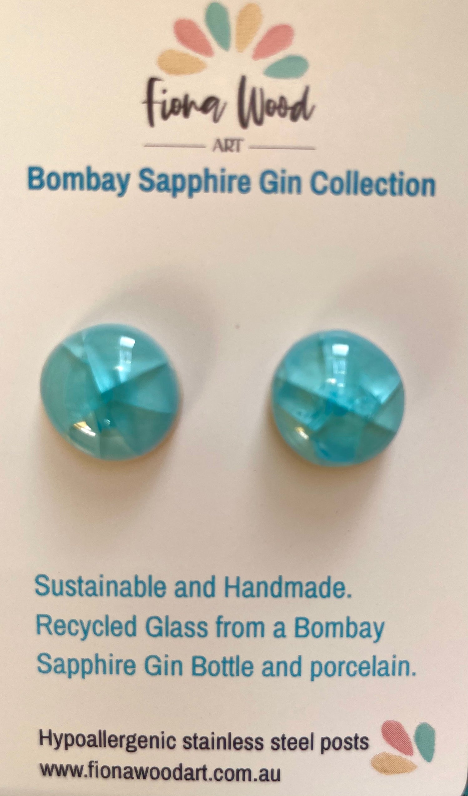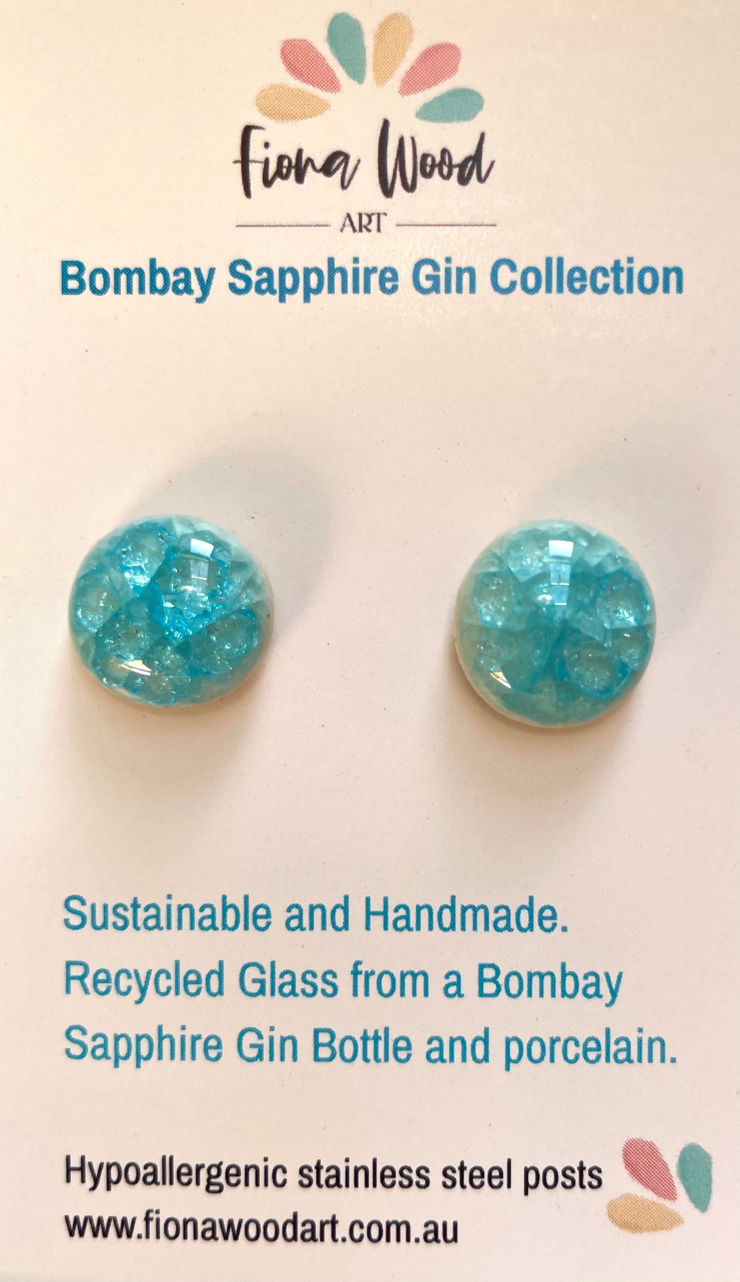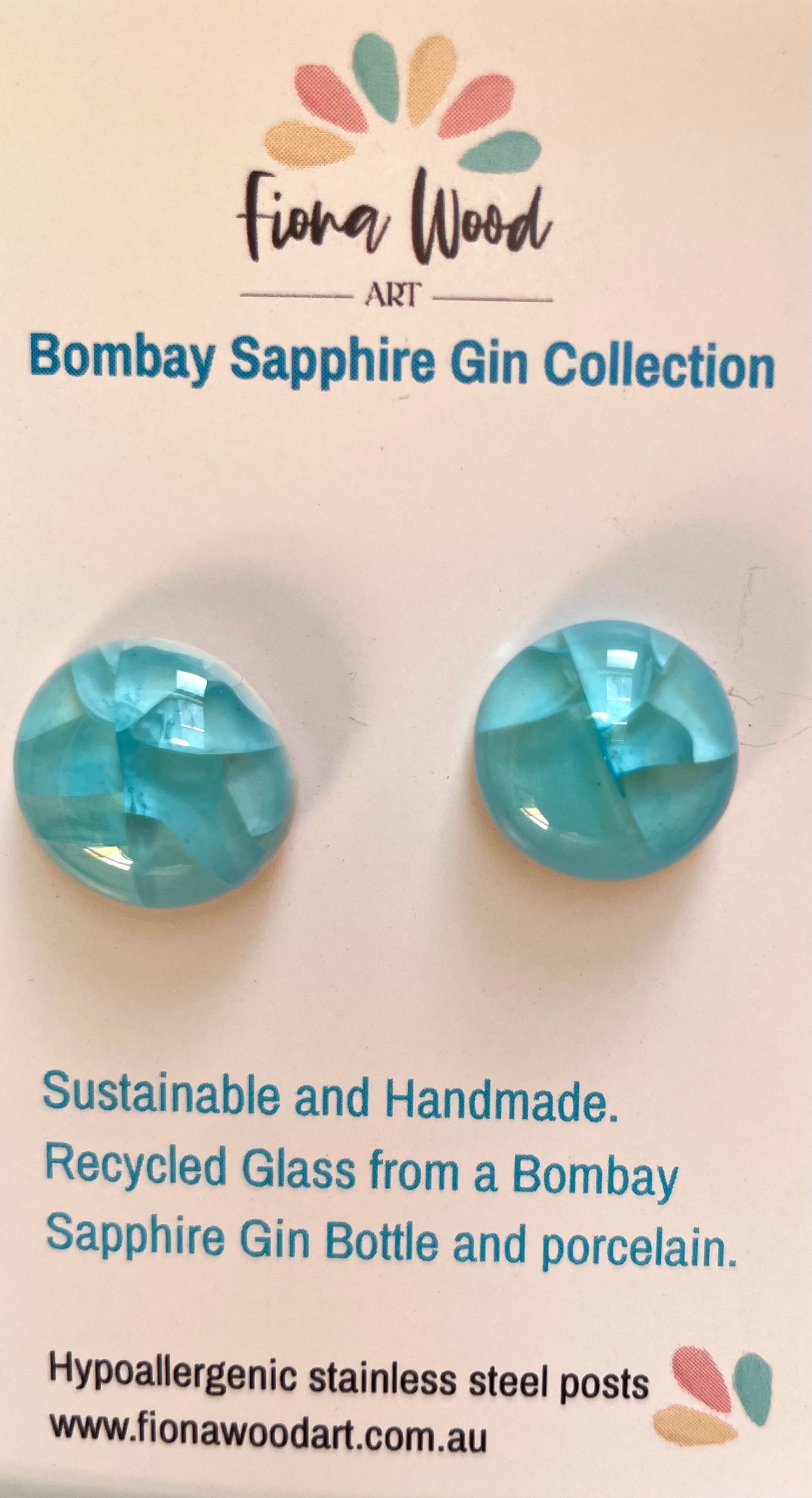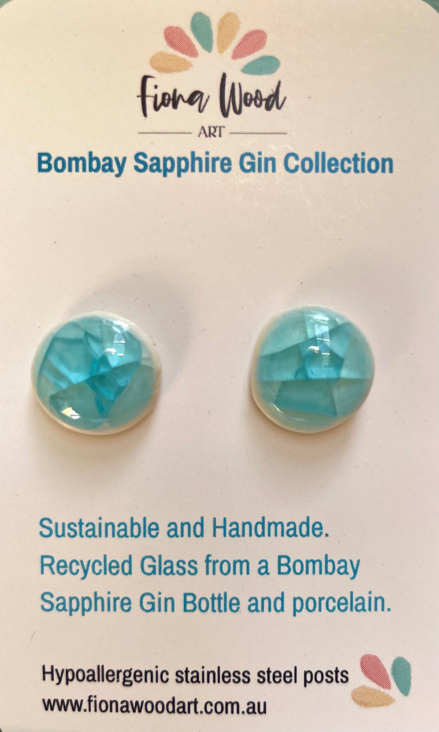 Sustainable and each pair unique these earrings have been made from recycled glass from a Bombay Sapphire Gin Bottle and porcelain clay.