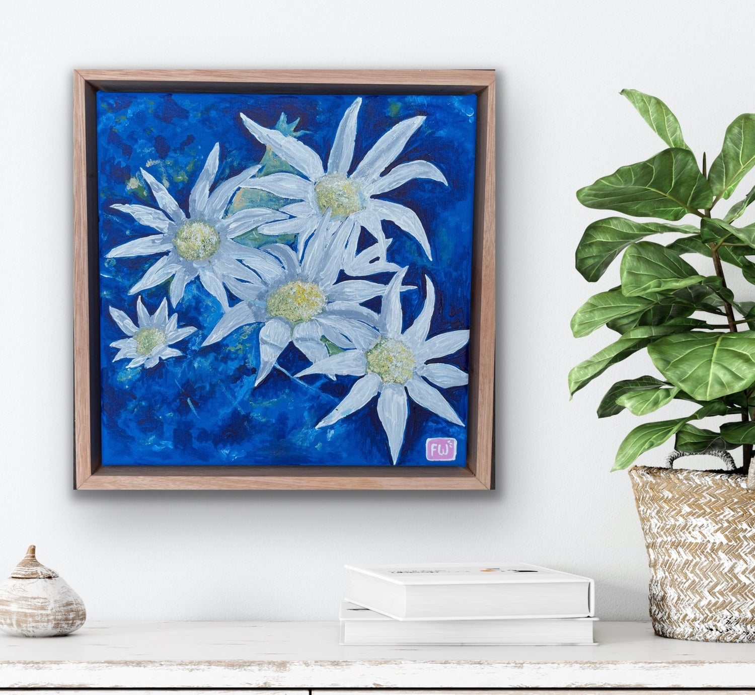 Original artwork by Fiona Wood. Painted in acrylics. On professionally stretched canvas with a Flooded gum frame. Canvas measures 25cm x 25cm. With frame 28cm x 28cm. Varnished and ready to hang.