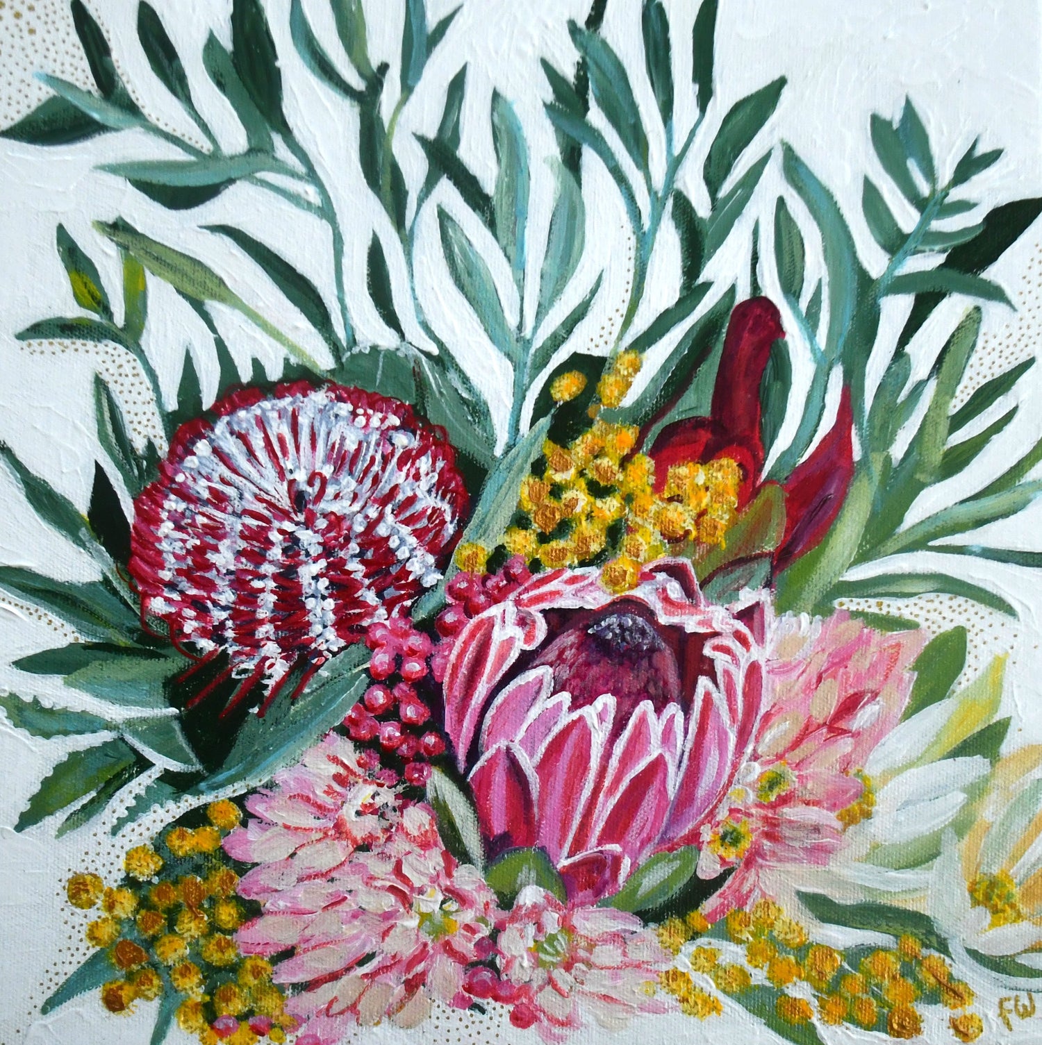 "Flowers in White Light". Protea flowers symbolise transformation, courage and diversity. Banksia flowers symbolise new beginnings, resilience and endurance. White light is seen as purifying, healing and cleansing representing hope and enlightenment.