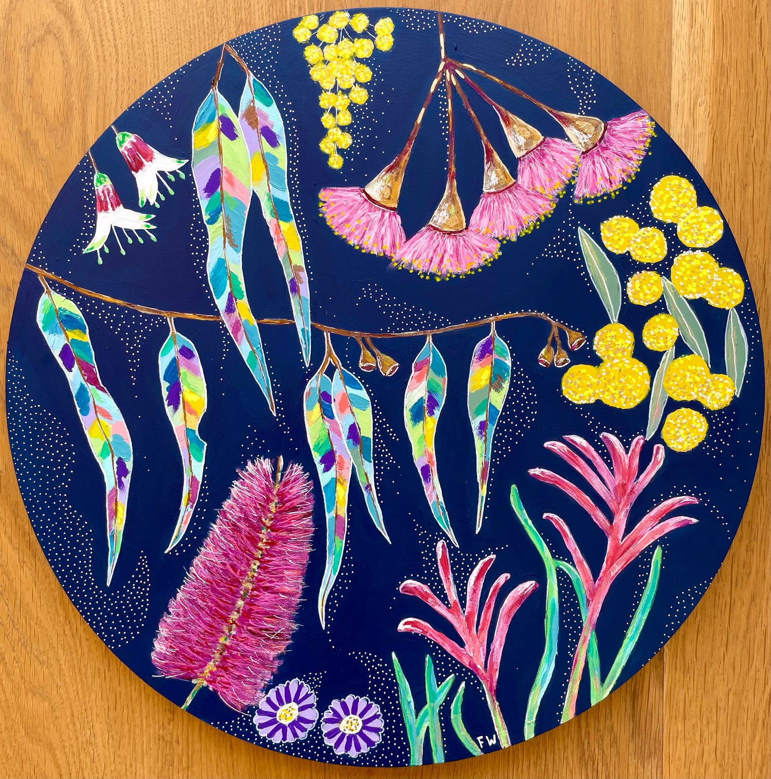 Original painting by Fiona Wood. Acrylic paint and Posca pen on round wood panel. 40cm diameter. Ready to hang.