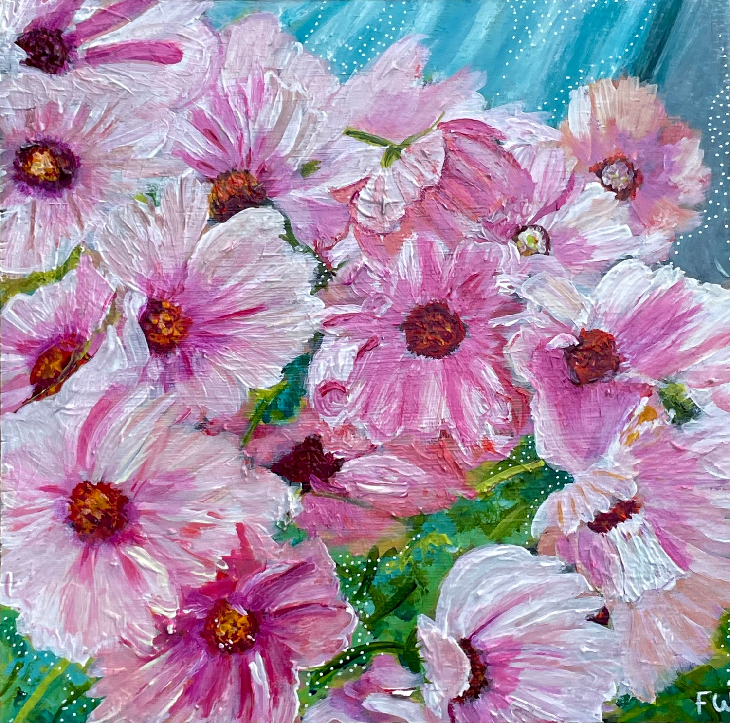 COSMOS. When you give someone a bunch of cosmos flowers you are giving them the universe. Bases on this cosmos flowers symbolise order, harmony and balance. Also, peace, tranquility, innocence, modesty and joy.