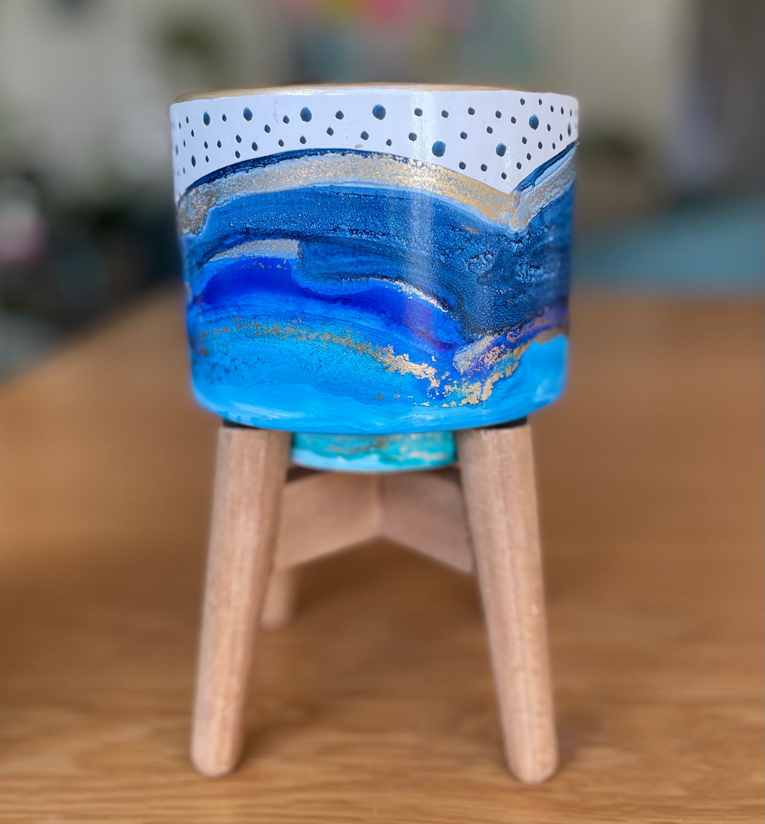 Hand-painted Inked Pot.  Sealed for protection. Hole has a silicon plug in it which can be removed. Comes with a wooden stand. Each pot is unique and one of a kind. Free Shipping.