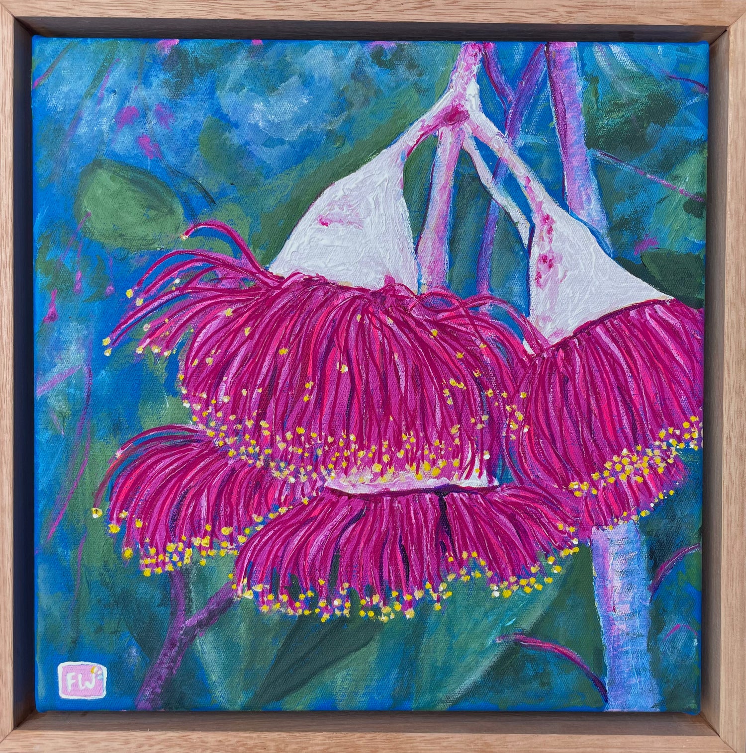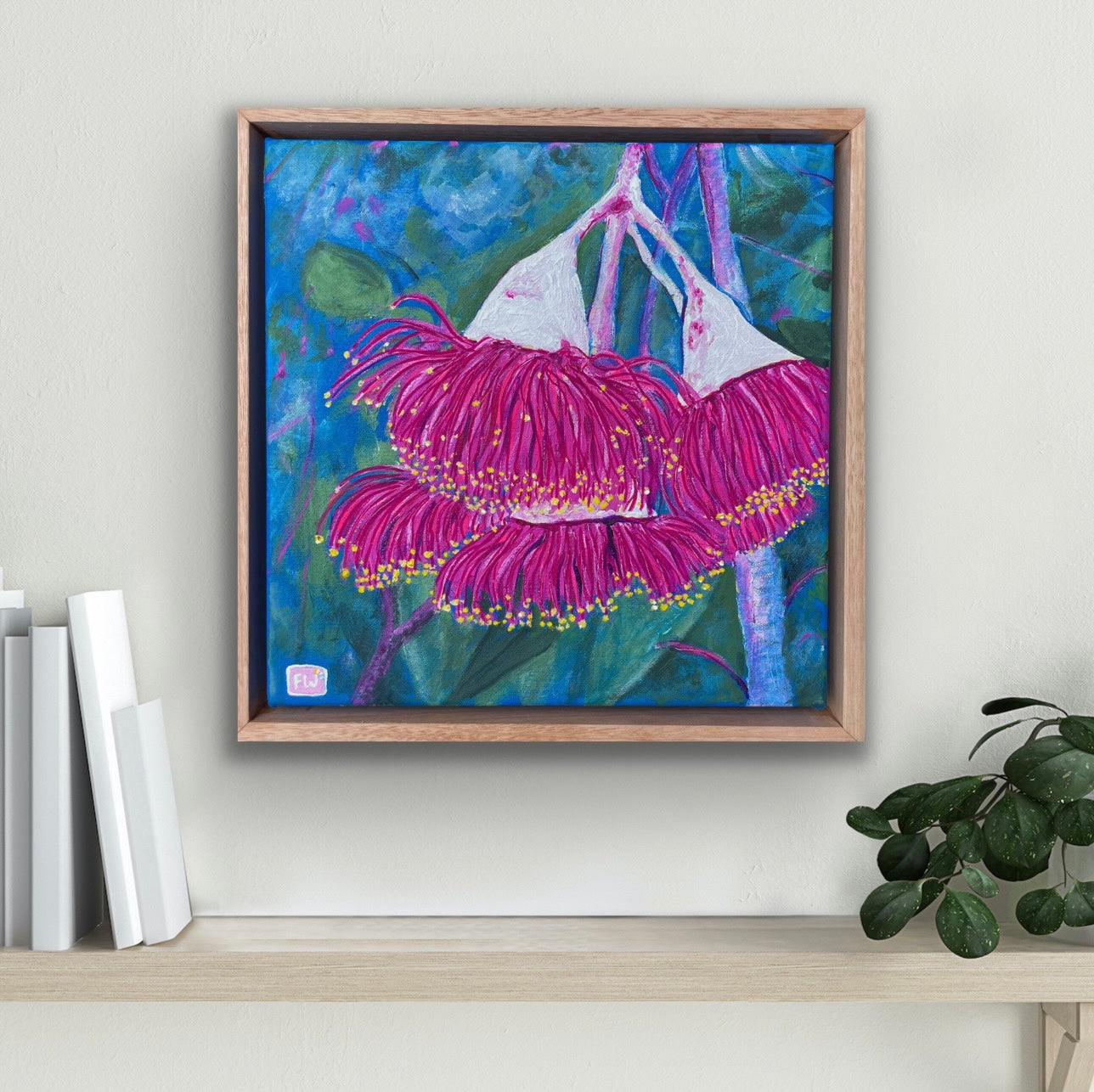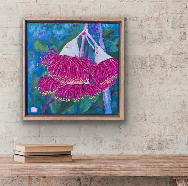 Original artwork by Fiona Wood. Painted in acrylics. On professionally stretched canvas with a Flooded gum frame. Canvas measures 25cm x 25cm. With frame 28cm x 28cm. Varnished and ready to hang.