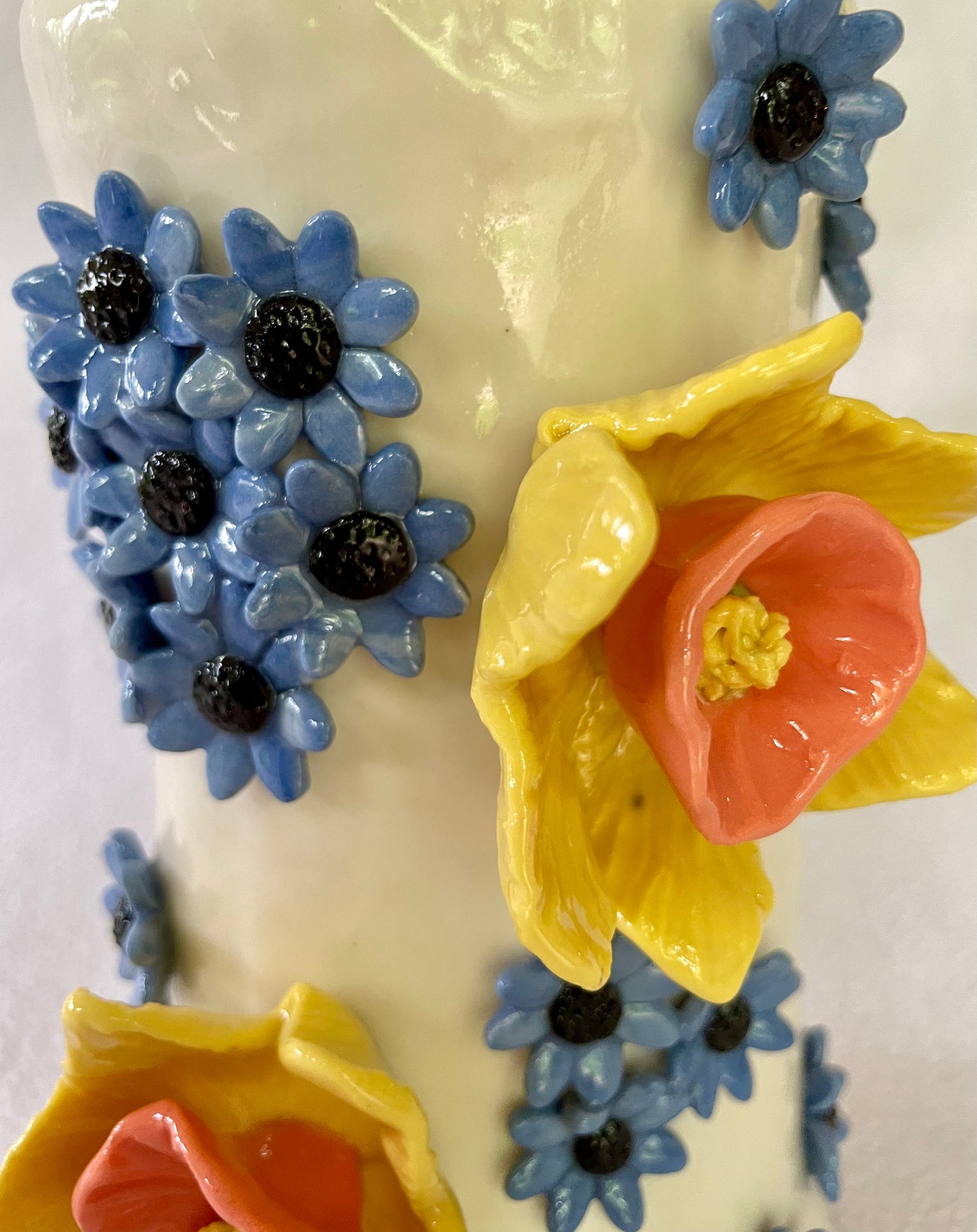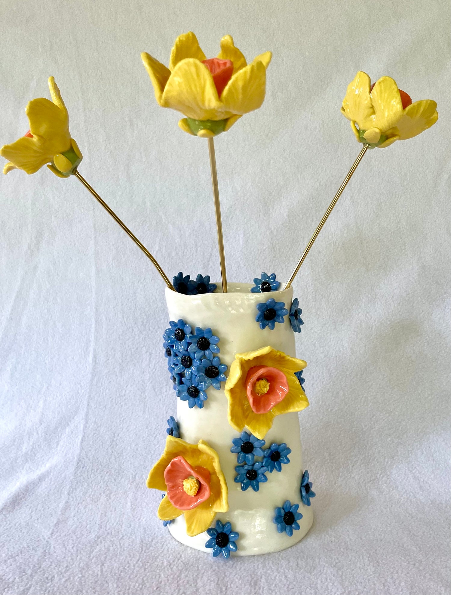 White & coloured porcelain vase with 3 daffodil flowers on brass rods.