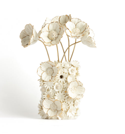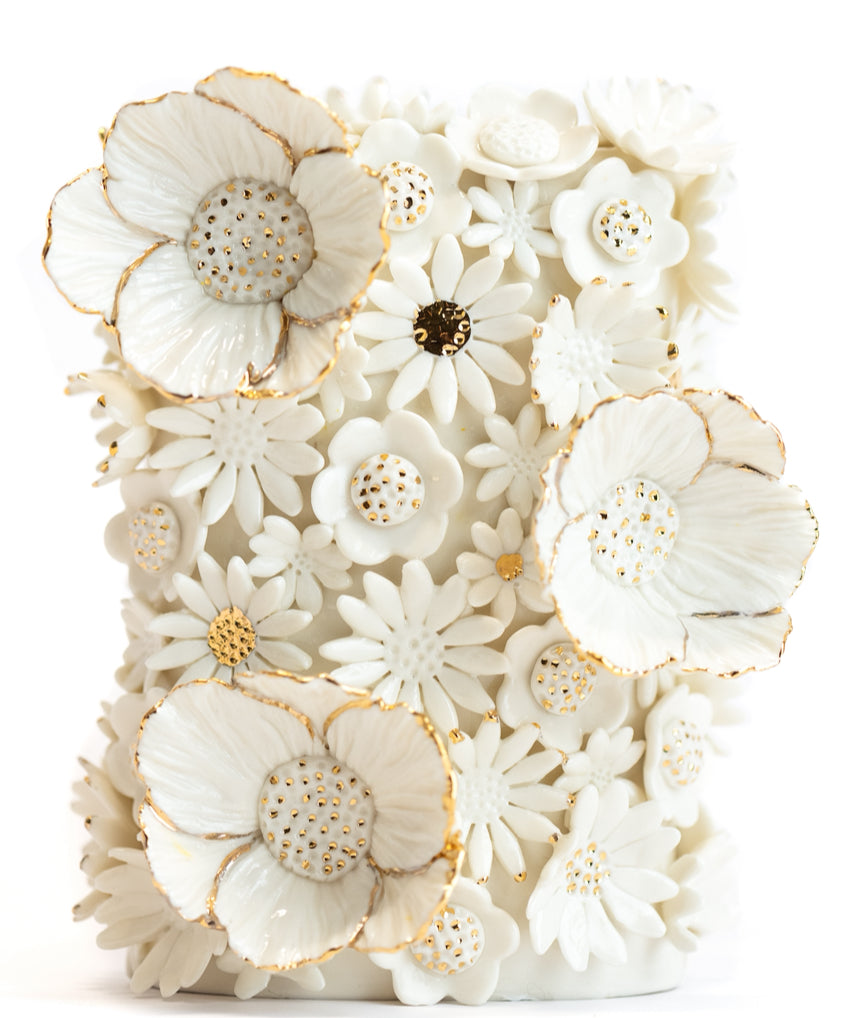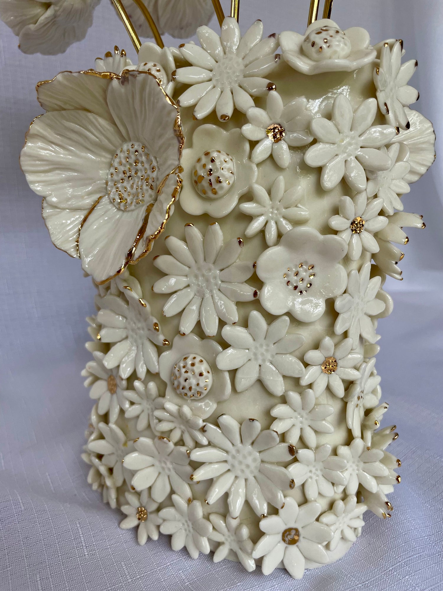 Adorned with sculpted blooms across its surface and rising from the top, this vase blurs the line between vessel and living form. The gold and white palette — a favourite in my work — symbolises purity, joy, friendship, and achievement, radiating warmth and quiet celebration.